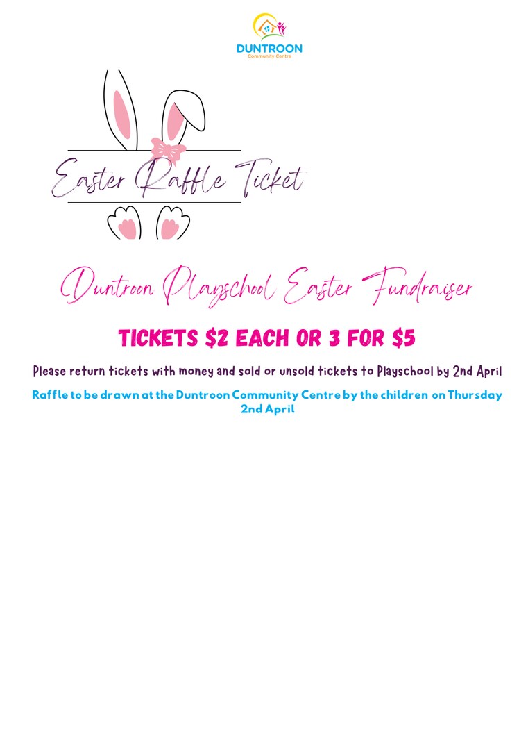 Raffle to be drawn at the Duntroon Community Centre by the children on Thursday 2nd April at 10am.
