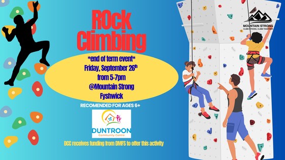 Duntroon Community Centre is excited to host our event with Mountian Strong testing your skills Rock Climbing. Join us for a fun after school afternoon learning the techniques used in scalling big and small walls.  Your ticket includes the climbing session (unlimited time) and the climbing shoe rental. We will be given a run down and how to by the proffesional staff and then we can climb freely. By purchasing this ticket you are agreeing to the following: We require more than 24hrs notice for any cancellations, otherwise tickets will be non-refundable. Parents/guardians must remain on site and are responsible for the supervision and safety of their own children for the duration of this event.