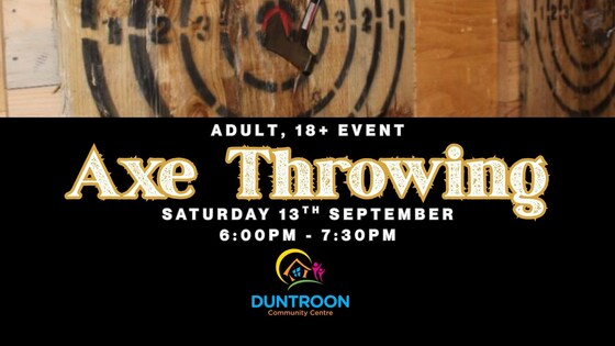 We've had our family events, cocktail night, school holiday events now this one is for the adults! Bring a date, gather some friends or come along solo to experience the ultimate axe-throwing with DCC at Axxe Canberra. Unlimited throws and a friendly coach available to ensure a fun, safe and unforgettable experience. Spots are limited—secure yours now! More activity info available via the AXXE webpage <https://axxe.com.au/?gad_source=1&gad_campaignid=21731279485&gbraid=0AAAAAqGswTwsNqQEkWrATq2-ockMEilRj&gclid=EAIaIQobChMIydf504-ijgMVvxSDAx0SMhdnEAAYASAAEgLw7fD_BwE> Cancellation Policy: Refunds are not available for cancellations within 48 hours of the event. If you need support booking your ticket please email coordinator@duntrooncommunitycentre.org.au. Please ensure you are logged in as a DCC VIP member to see available tickets.  This event is subsidised through funding from Defence Member and Family Support, ensuring accessible pricing for current serving Defence families.