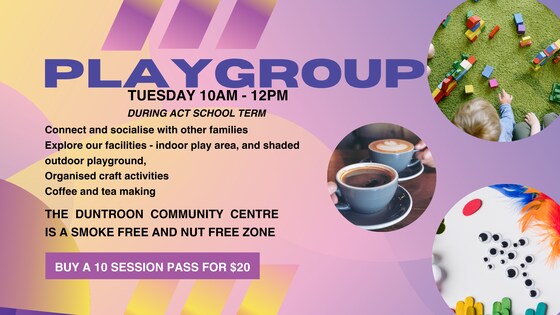 The Playgroup at the Duntroon Community Centre offers a welcoming environment for children aged 0-5 years and their carers. Led by our volunteer facilitator we meet every Tuesday from 10 am to 12 pm (during the ACT school terms).  We invite everyone to connect and socialise, while exploring our facilities, which include an indoor play area, a shaded outdoor playground, organised craft activities, and access to coffee and tea making facilities in our fully equipped kitchen. Please bring everything you and your child might need to enjoy a fun morning with us. DCC is a nut-free and smoke-free zone. ***** If you wish to attend playgroup, please join as a 2025 DCC VIP Member and purchase a 10-session program pass for $20. Please purchase one program pass per family. You can sign up for a 2025 VIP membership here: https://duntrooncommunitycentre.tidyhq.com/member/memberships. DCC Free members are entitled to two free trial sessions. Please be aware that our staff and volunteer facilitators will be monitoring attendance and will follow up on this requirement.  The funds generated from your membership and session pass allow us to purchase resources to provide craft activities for playgroup. ***** If you would like further information, or you are having trouble registering for playgroup contact the Centre Coordinators Carmel and Jane via email at coordinator@duntrooncommunitycentre.org.au