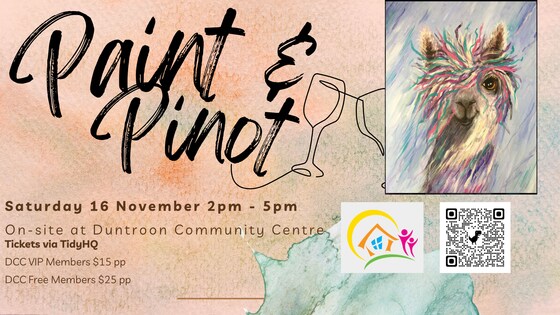 Paint & Pinot! Saturday 16 November 2pm - 5pm at DCC This event is for our adult community members; join us for an afternoon of painting and fun! We will have everything provided for you to get creative be guided by an artist, enjoy an alcoholic or non-alcoholic beverage or two and socialise! This is BYO event, Duntroon Community Centre strongly encourages the responsible consumption of alcohol.  Please note this event is for adults only. We understand situations arise when you may need to cancel. Please notify us at least 24 hours in advance. No refunds will be provided for cancellations with less than 24 hours notice given.