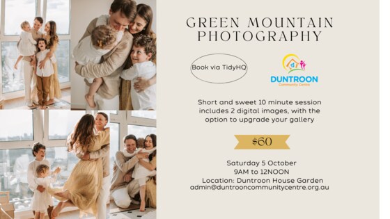 Saturday 5 October at Duntroon House Garden Join us for a DCC Photo Fundraiser Day with the support of Green Mountain Photography. Enjoy a short and sweet 10-minute session capturing beautiful moments. Each session includes 2 digital images, with the option to upgrade your gallery.   We understand situations arise when you may need to cancel. Please notify us at least 24 hours in advance. No refunds will be provided for cancellations with less than 24 hours notice given.